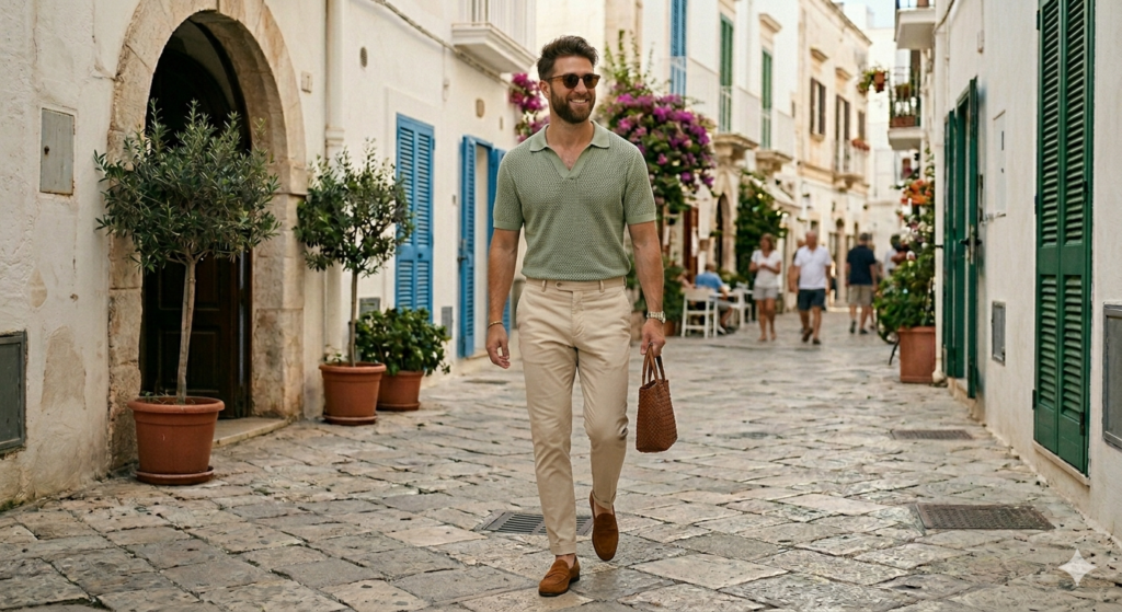 This outfit sits firmly in smart-casual summer territory. The suede loafers add a premium feel without requiring socks (which is its own summer luxury). Keep everything slim and fitted — knit polos lose their charm when they’re oversized.