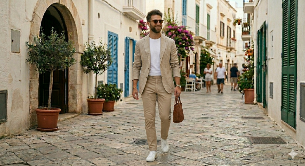 The Outfit: Unstructured linen blazer (beige, cream, light grey, or navy) + plain fitted tee (white or navy) + slim chinos + loafers or clean white trainers