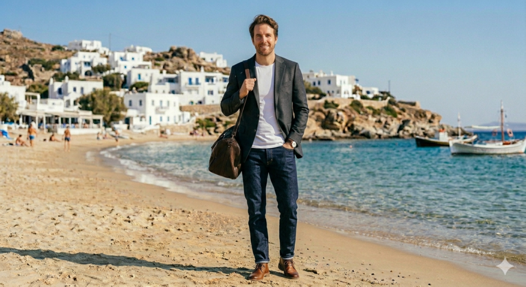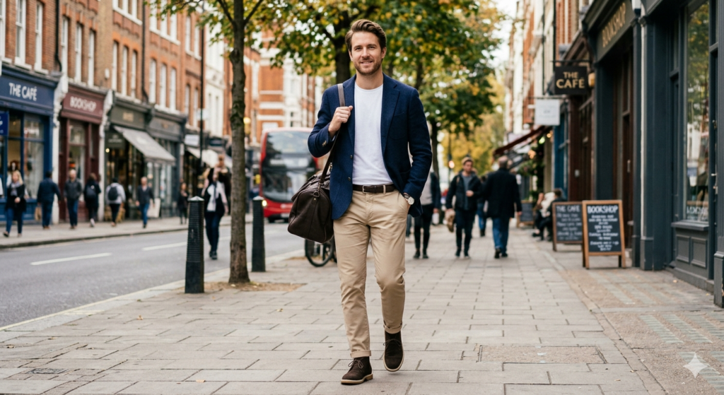 The power of a blazer is that it instantly transforms whatever sits beneath it. A white tee under a navy blazer with beige or tan chinos is one of the most reliable smart-casual outfits in men’s fashion — versatile enough for a work meeting, sharp enough for a dinner reservation.