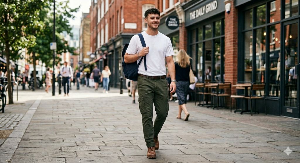 The contrast between the clean white tee and the textured, earthy olive of the cargos is what makes this work. Keep accessories minimal — a simple watch is enough.