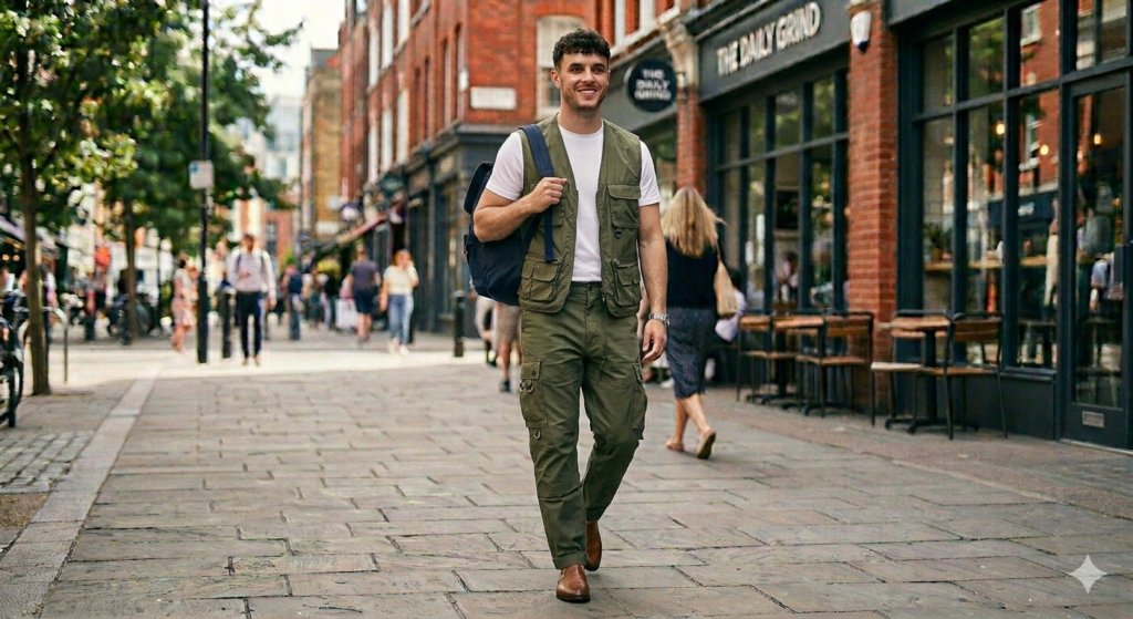 The utility or tactical vest trend is one of the most interesting developments in men’s fashion in recent years. A slim white tee under an olive or tan utility vest with matching cargo trousers creates a strong, purposeful look with strong streetwear and workwear influences.