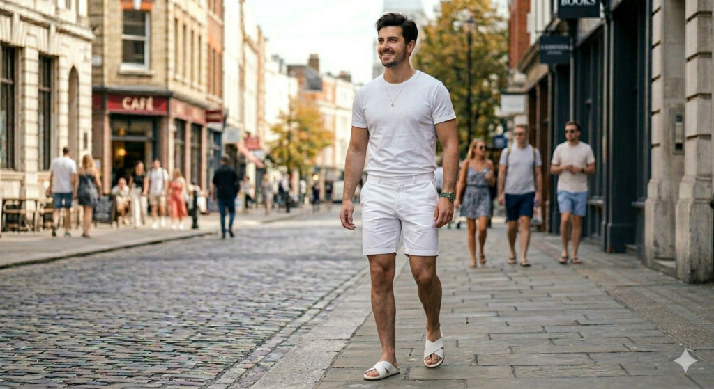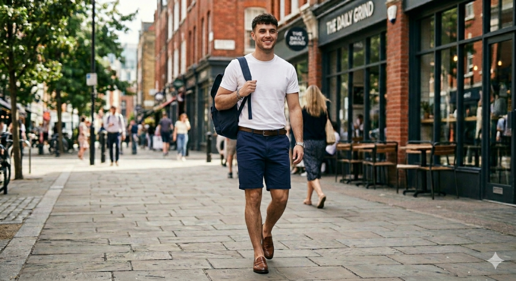 For warm-weather smart-casual, this combination punches well above its weight. The loafers do all the heavy lifting — they instantly prevent the shorts and white tee from reading as too casual, transforming the outfit into something refined enough for a summer lunch or a casual rooftop bar.