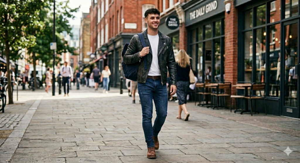 One of the most enduring looks in men’s style. A slim white tee, a fitted leather jacket (black or dark brown), and skinny or slim jeans with boots — this is the rock-and-roll uniform, and it still lands every time. The white tee keeps the look from feeling too heavy or brooding.