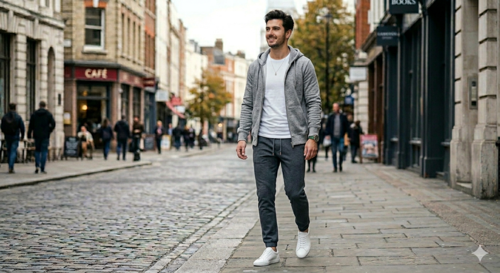 The most comfortable outfit on this list — and when executed properly, a genuinely stylish one. A slim white tee under a fitted zip-up hoodie (in grey, black, or navy) with tapered joggers and clean sneakers is the modern casual uniform that works for everything from coffee runs to remote-work days to weekend errands.