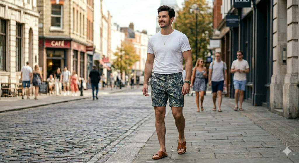 Maximum summer energy. A clean white tee anchors a pair of patterned or printed shorts (tropical print, abstract pattern, bold stripe) by giving the eye a neutral resting point. The print does the talking; the tee keeps everything from getting chaotic.
