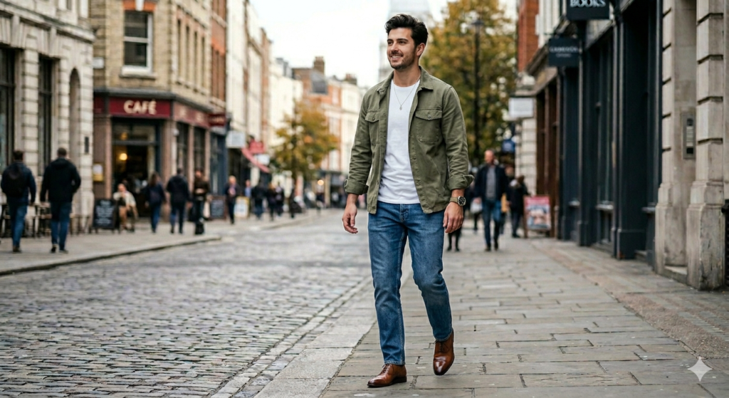 Layering a white tee under an overshirt (also called a shacket — a shirt-jacket hybrid) is one of the most practical style moves in cooler weather. The white tee peeks out at the collar and cuffs, adding a clean layering element that makes the whole outfit feel considered.