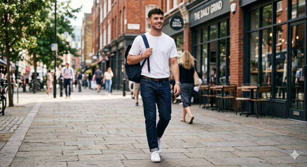 The ultimate casual classic. Dark indigo jeans and a clean white tee create instant contrast, and white sneakers pull the whole palette together in a way that looks effortless. Keep the tee fitted — not tight — and make sure it’s a proper bright white, not yellowed or washed-out grey.