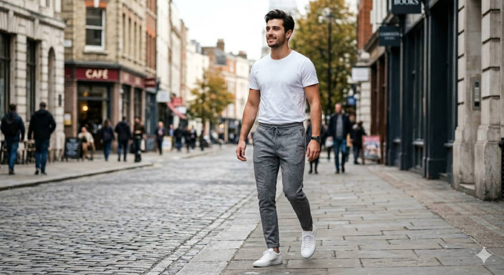 Hear this one out. A well-fitted white crew neck tee paired with tapered grey sweatpants and clean white sneakers is a legitimate style choice — not just an “I give up” outfit. The key is in the fit and the quality of each piece. Everything needs to be clean, fitted, and intentional.