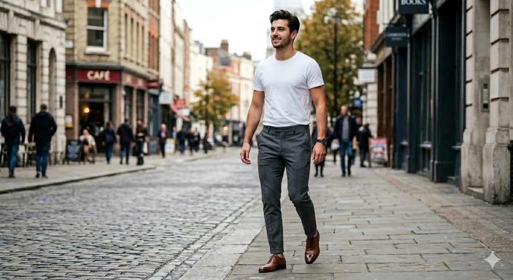 This is where the white tee becomes genuinely elevated. Pairing a premium cotton white tee — one that fits impeccably and has real fabric weight — with well-cut tailored trousers and Oxford shoes creates a modern, minimalist look that requires real confidence to pull off.