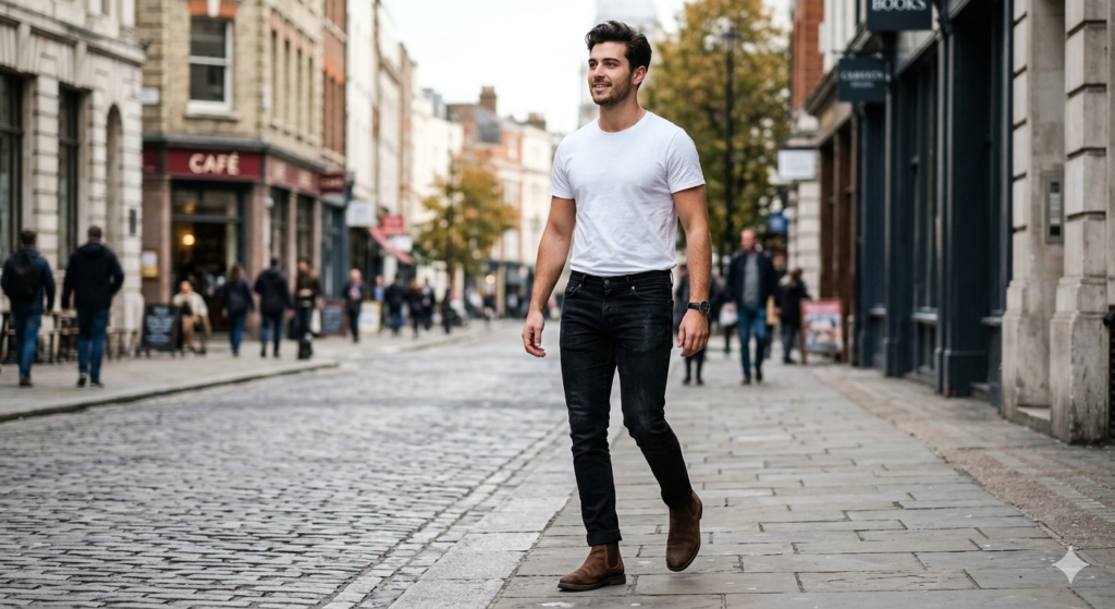 This is the go-to combination when you want to look sharp without putting on a collared shirt. Black jeans lift the sophistication of a plain white tee, and Chelsea boots close the gap between casual and smart-casual instantly.