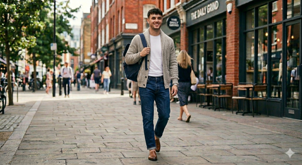 A thick-knit cardigan over a white crew neck tee is a cosy, relaxed combo that leans into the whole “smart casual without trying” energy. The white tee visible at the neckline and cuffs adds a layering detail that makes the outfit feel complete.