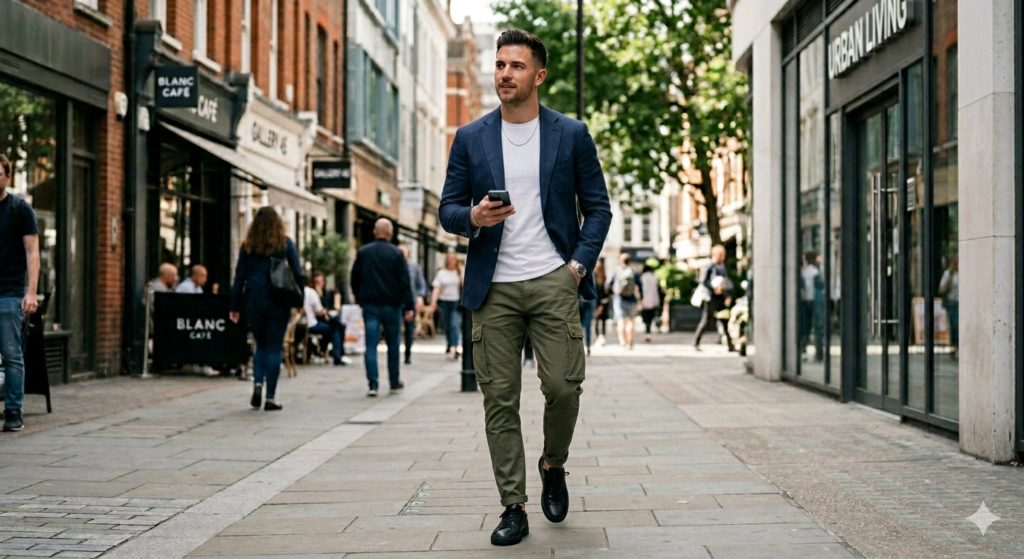 Cargo pants had a full resurgence and haven’t left — and black sneakers are the natural footwear partner. Modern tapered cargos in olive, charcoal, black, or khaki with black sneakers gives you a utilitarian, street-influenced look that feels current and intentional.